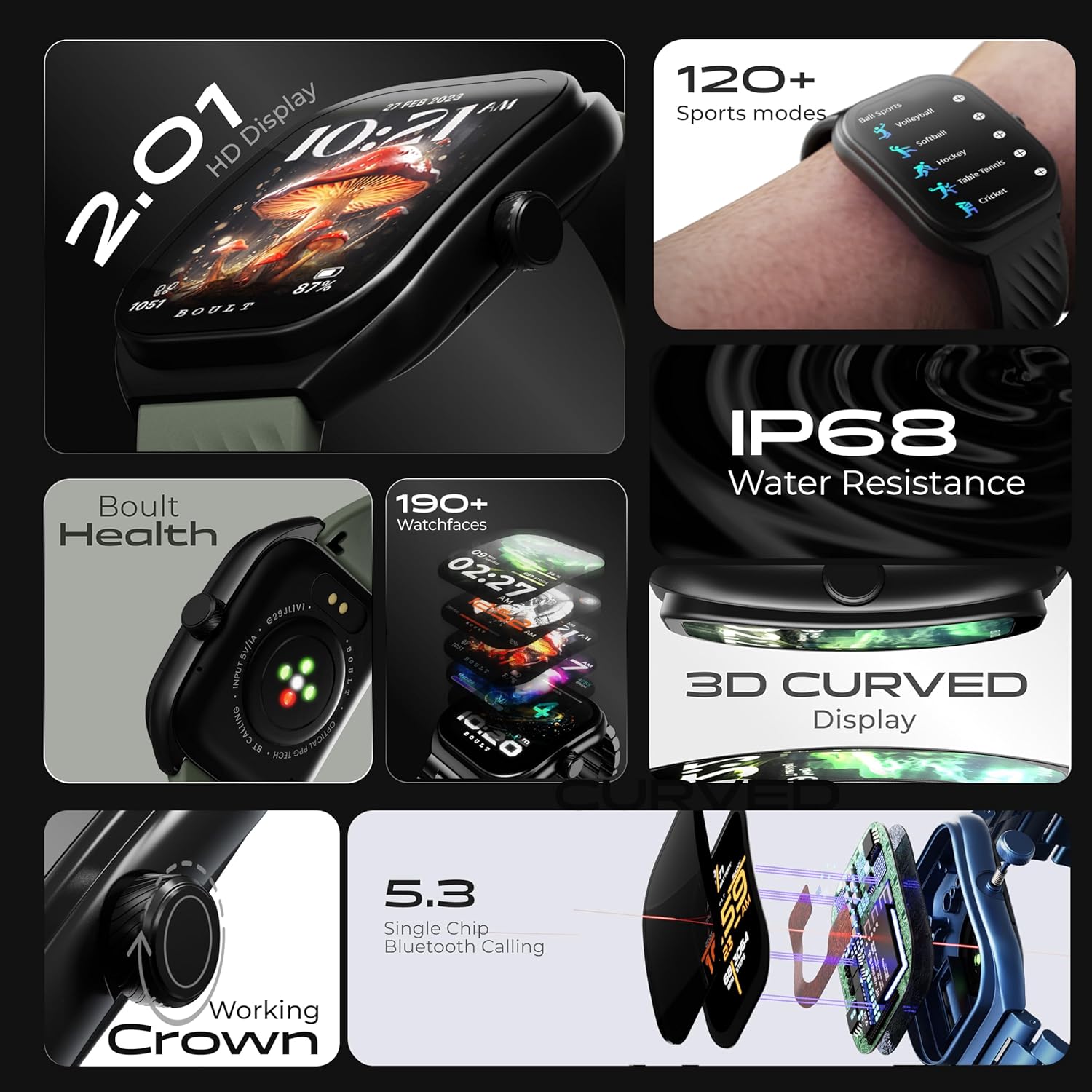 Boult Trail Smart Watch 2.01” 3D Curved HD Display, BT Calling, Working Crown, 190+Watchfaces,(Raven Black)