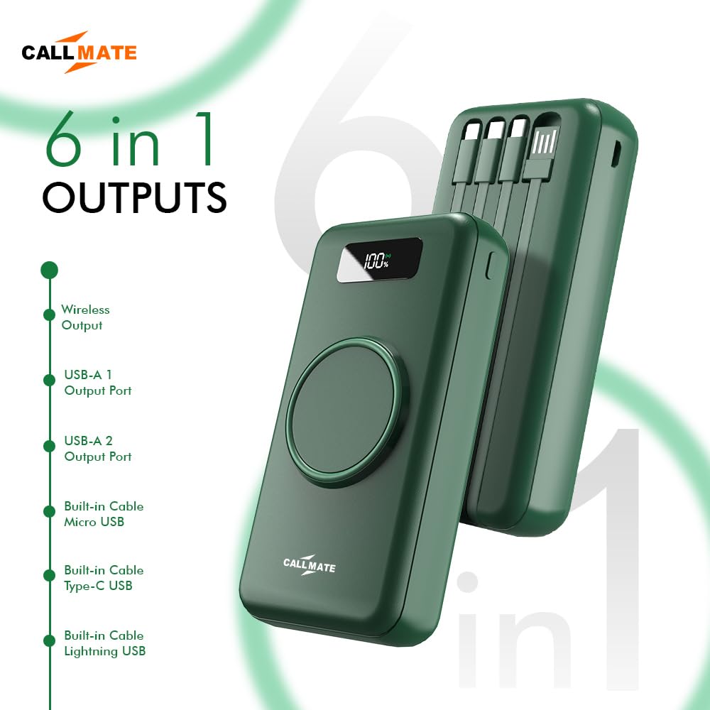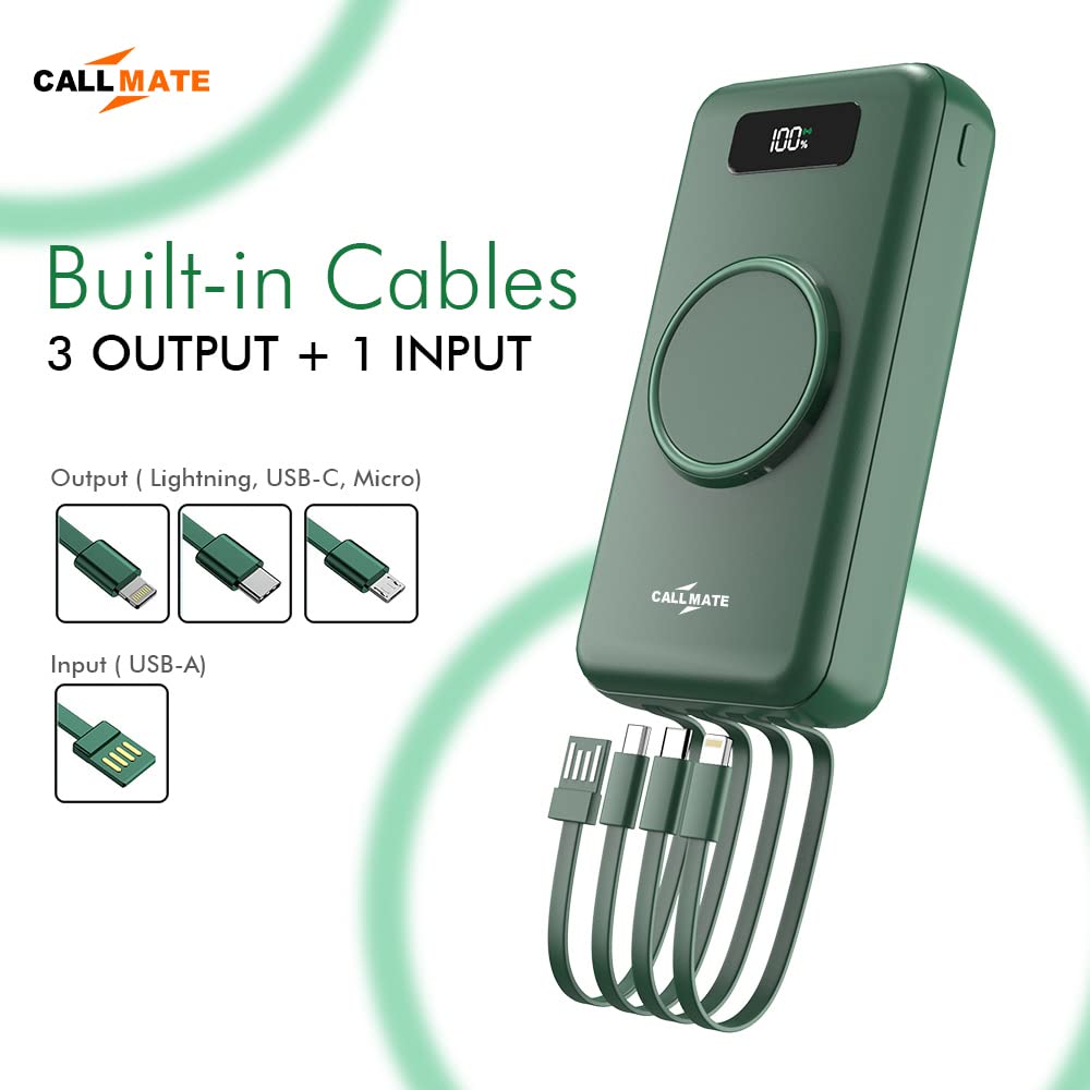 【Built-in 4 cables + 10W wireless charging】Wireless portable charger supports 5W, 7.5W, and 10W MAX wireless fast charging; Built-in 3 5V2.1A output cables, for i-Phone, Type-C, Micro, and 1 USB input cable.