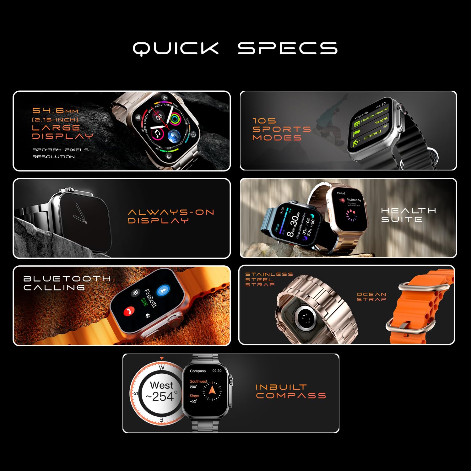 Special Feature Accelerometer, Activity Tracker, Alarm Clock, Calorie Tracker, Camera, Notifications, Pedometer, Phone Call, Sedentary Reminder, Sleep Monitor, Text message, Time Display, Spo2 (Blood Oxygen Monitoring), Heart Rate Tracking, Bluetooth Calling, IP68 Smartwatch, 2.02″ Display, 320*385 Pixel High Resolution, Built In Mic & Speaker, Voice Assistant, Games, Find Phone, Daily Workout Memory, Distance Tracker, Multisport Tracker, Music Player