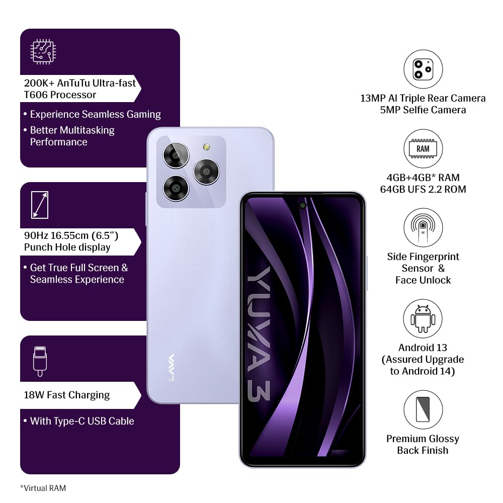 Lava Yuva 3 (Cosmic Lavender,4+4*GB RAM,UFS 2.2 64GB Storage)