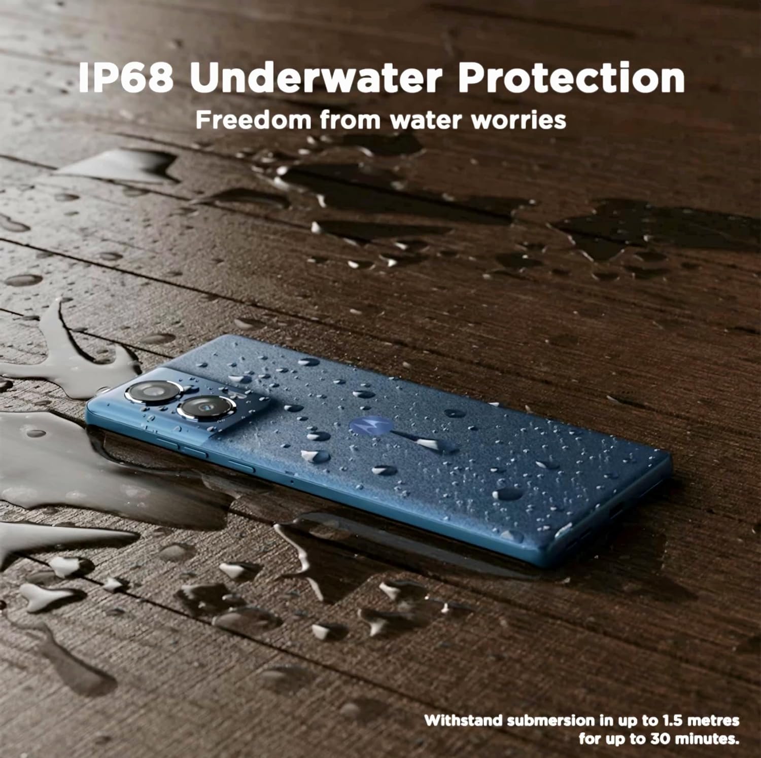 IP68 Underwater Protection with Smart Water Touch Go worry-free on your adventures with the Motorola edge IP68 underwater protection, engineered to withstand dust, dirt, and sand, along with submersion in 1.5 meters of freshwater for up to 30 minutes. Now, getting wet is just one less thing to worry about.  Worry free display usage with Smart Water Touch technology.