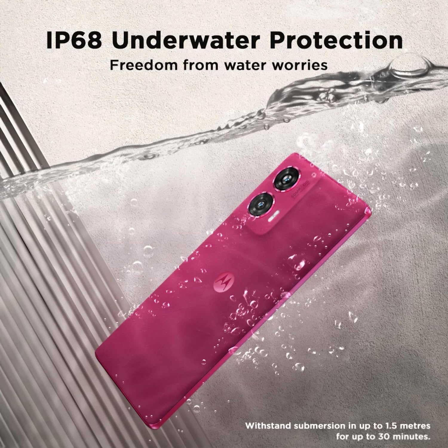 IP68 Underwater Protection with Smart Water Touch Go worry-free on your adventures with the Motorola edge IP68 underwater protection, engineered to withstand dust, dirt, and sand, along with submersion in 1.5 meters of freshwater for up to 30 minutes. Now, getting wet is just one less thing to worry about.  Worry free display usage with Smart Water Touch technology.